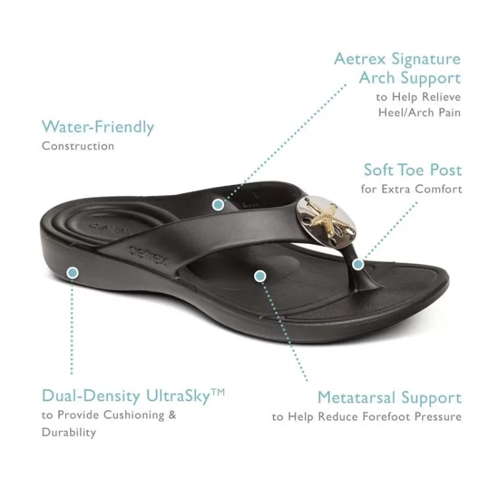Feel The Comfort And Support Of Aetrex In The Maui! These Orthotic Flips With Arch Support Are Made From Ultrasky&Trade; Injected Eva To Provide Extreme Cushioning, Shock Absorption And Durability. The Starfish Embellished Toe Post Is Specially Designed With Super Soft Foam To Keep Your Toes Comfortable All Day Long. With The Maui Flips You’Ll Feel Like You’Re Walking On Air! The Aetrex Orthotic System Is Built-In To Every Pair:Arch Support Helps To Stabilize And Align Feetarch Support Helps To Relieve Common Foot Pain & Plantar Fasciitisultrasky&Trade; To Cushion And Provide Superior Comfortcontoured Rearfoot To Cradle Your Heel And Relieve Pressuresupport Pod To Help Relieve Forefoot Pressuredetails:Adjustability: Nonematerial: Lightweight Ultrasky&Trade; For Comfortremovable Insole: Noneheel Height: 1.1″Metatarsal Support To Help Reduce Ball-Of-Foot Discomfortsoft Toe Post For Extra Comfortextreme Cushioning And Shock Absorption To Help Prevent Injury And Provide Unmatched Supportwater-Friendly Construction, So Light They Float