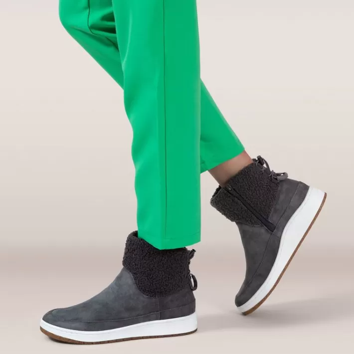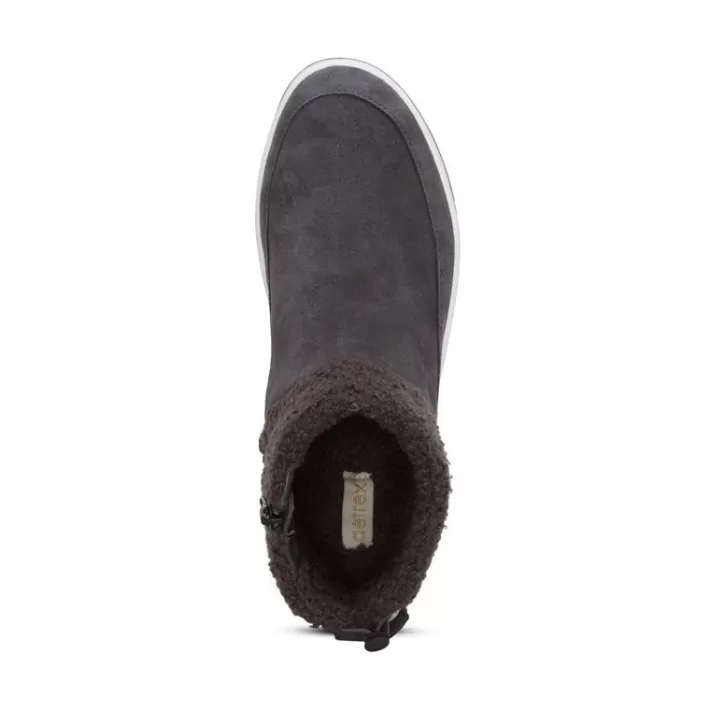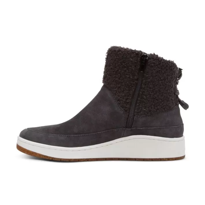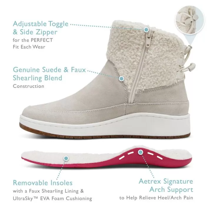 Feel All-Day Support In The Winnie! This Weather-Friendly Genuine Suede Bootie And Its Removable Insole Are Lined With A Sherpa To Keep Each Step Cozy. The Arch Support And Cobra Orthotic Technology Will Keep You Comfortable All Day Long. The Aetrex Orthotic System Is Built-In To Every Pair:Our Insole Features Arch Support That Helps To Stabilize Your Body, Align Your Feet And Relieve Common Foot Pain (Ie. Plantar Fasciitis, Heel Pain & Arch Pain)Our Insole Features Ultrasky Cushioning To Provide Pressure Relief & Extra Comfort Details:Adjustability: Side Zipper And Bungee Closureupper Material: Weather-Friendly Genuine Suede And Sherpaall Materials Thoroughly Treated To Help Protect Against Rain And Puddlesoutsole Material: Lightweight Cork And Rubber Blendremovable Insole: Yes Sherpa Inner Lining And Removable Insole For Extra Comfortheel Height: .75″