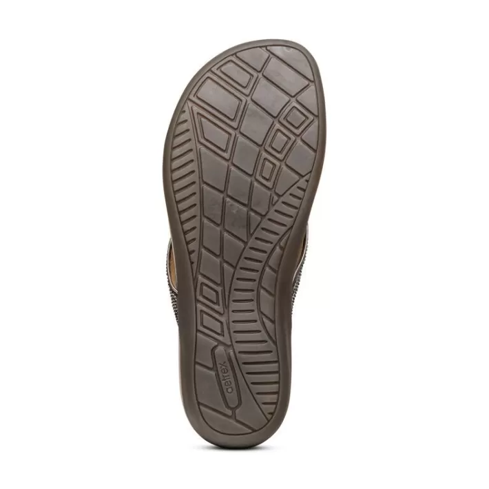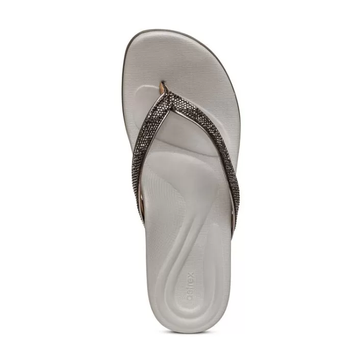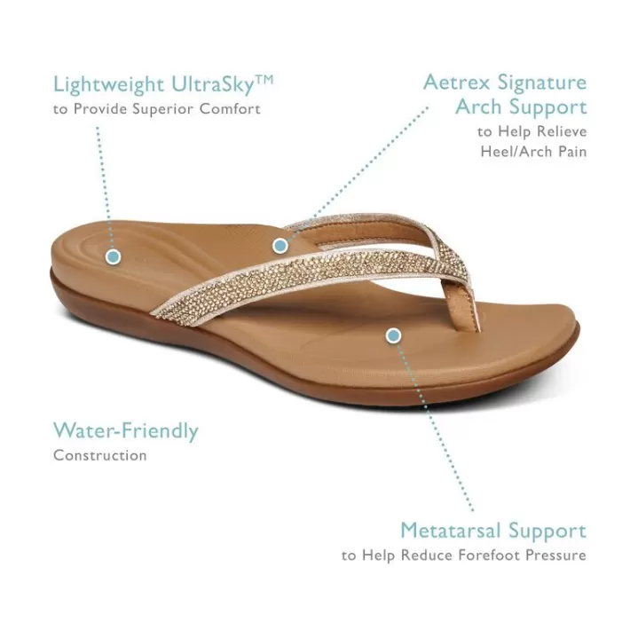 Add A Little Sparkle To Your Outfit This Summer With The Eve! This Thong Sandal Provides Arch Support And Pressure Relief Technology Throughout The Footbed No Matter Where The Sunny Day Takes You. The Aetrex Orthotic System Is Built-In To Every Pair:Arch Support Helps To Stabilize And Align Feetarch Support Helps To Relieve Common Foot Pain & Plantar Fasciitisultrasky&Trade; To Cushion And Provide Superior Comfortcontoured Rearfoot To Cradle Your Heel And Relieve Pressuresupport Pod To Help Relieve Forefoot Pressuredetails:Adjustability: Nonematerial: Faux Leather Treated With Antimicrobial Technology To Help Fight Every Day Odorsmidsole Material: Ultrasky&Trade; For Comfortoutsole Material: Rubber For Durabilityremovable Insole: Noneheel Height: 1.2″Water-Friendly